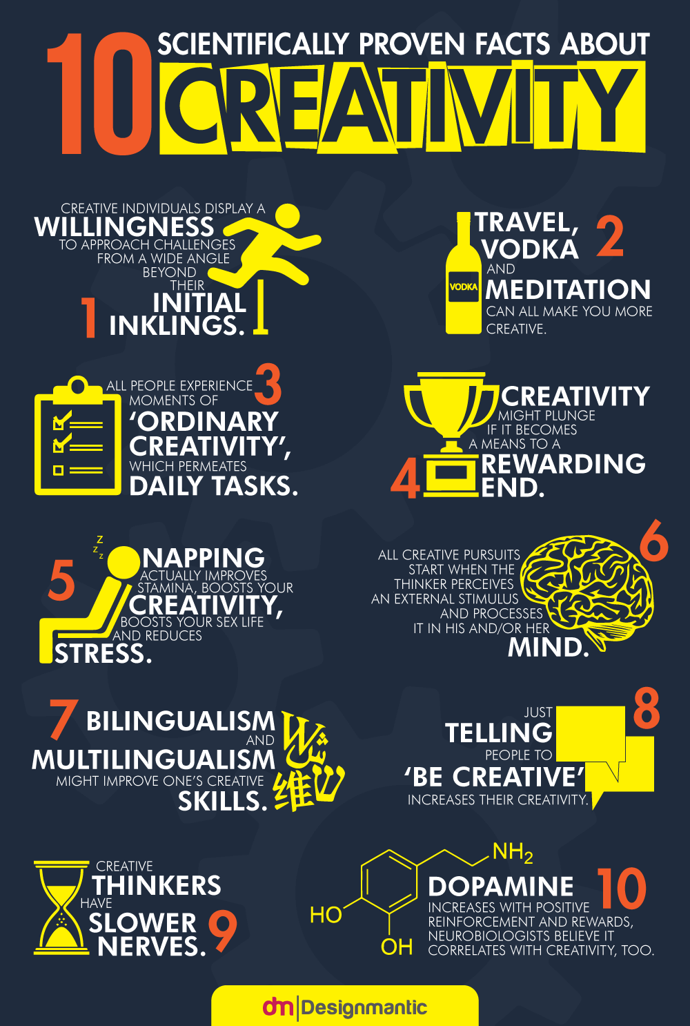 Did you know everybody experiences moments of “ordinary creative thinking,” which permeates in their daily tasks? Yes, anyone and everyone can be creative in their own method. These are the dreamers and more importantly, these are the people who put ‘the mother of invention’ in ‘necessity’. No great things were ever accomplished by those who suffered from an utter lack of imagination. Design Mantic has created a infographic to show 10 facts which are scientifically proven, research based, facts about creativity that will blow your mind away. Happy Reading!