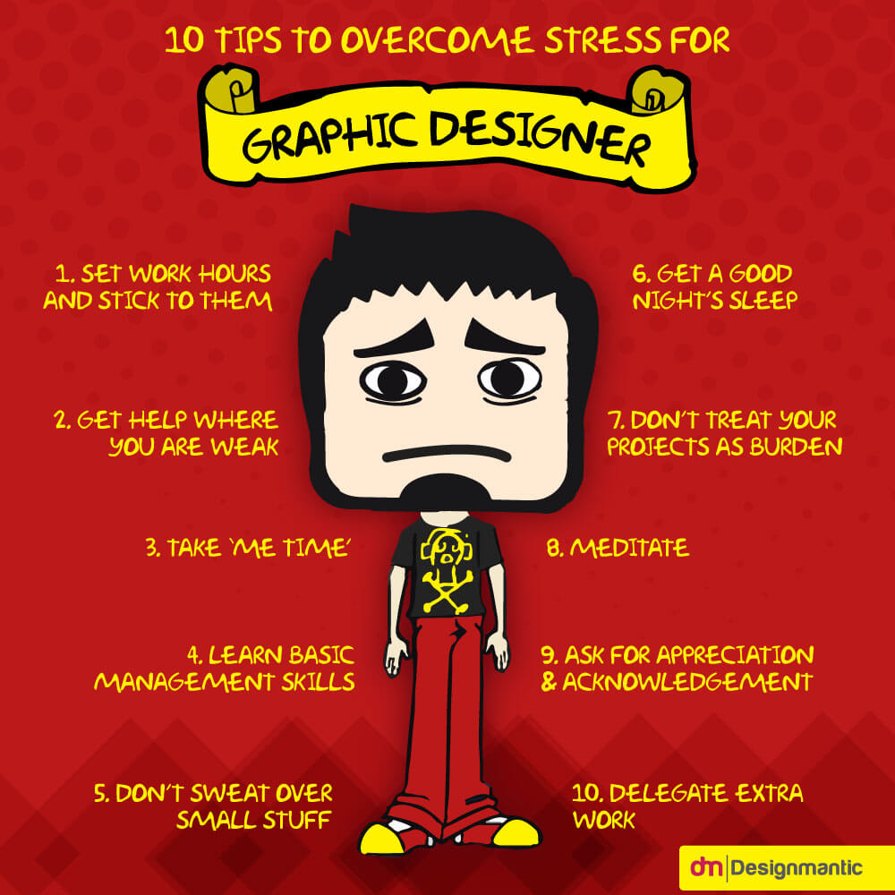 As a Graphic Designer, you like the freedom and creativity. But stress is also part of the design process. From the deadline to getting punchline right, designers go through stress and exhaustion in different forms at different levels. Therefore, it is crucial for graphic designers to learn to overcome stress. Worry not if you didn’t have a chance to put your mind on this earlier, DesignMantic blog has created an infographic tips to beat Graphic Designer’s stress, take a look at this infographic: