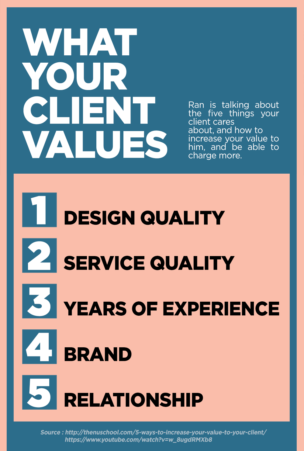 Do you find yourself thinking about how to increase your client value? Many freelancers assume our client cares only about the quality of our design work. While it’s true that he cares how awesome our design is, the client also cares about other things. An author of “The NU School” Ran Segall is talking about the five things your client cares about, and how to increase your value to him, and be able to charge more.