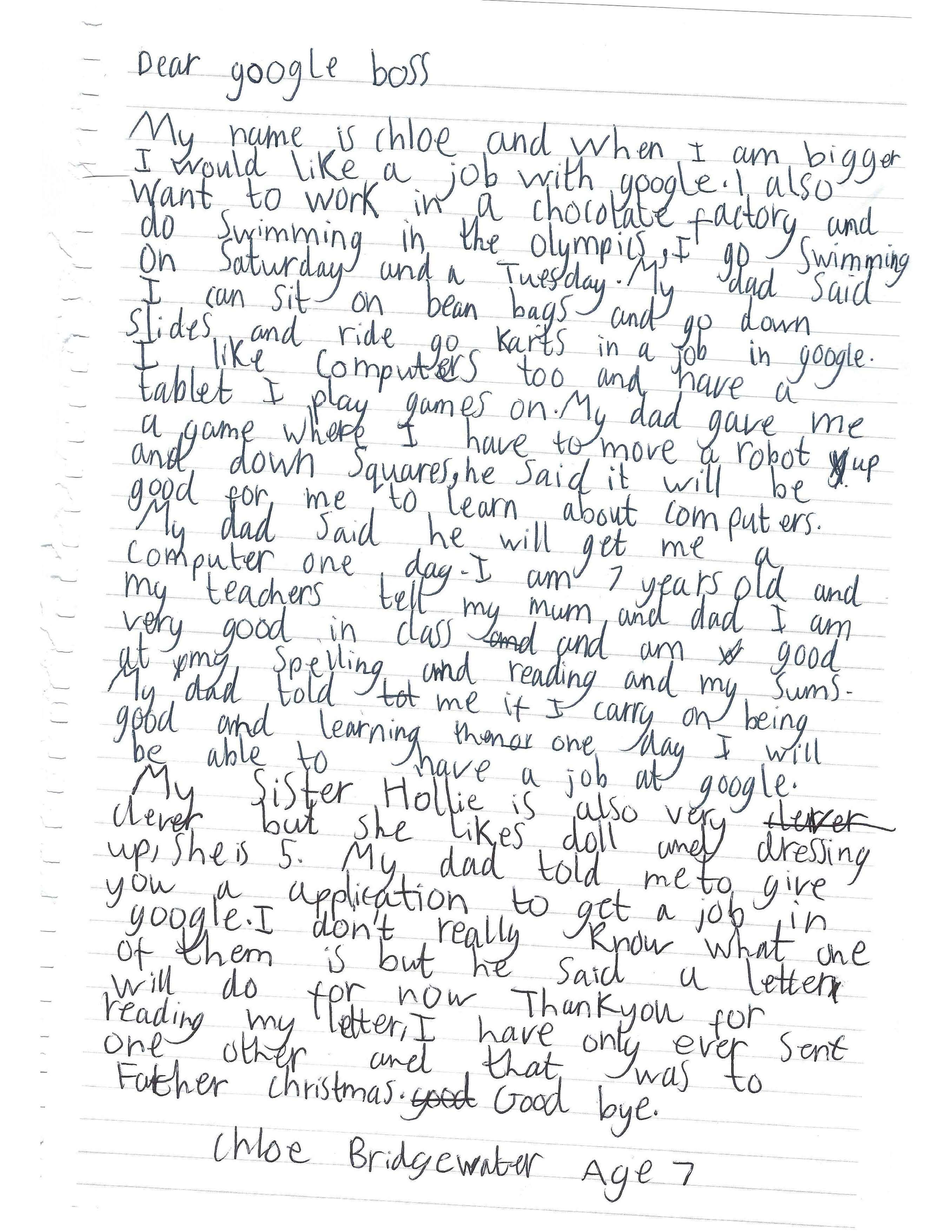 My name is Chloe and when I am bigger I would like a job with Google. I also want to work in a chocolate factory and do swimming in the Olympics. I go swimming on Saturday and a Tuesday. My dad said I can sit on bean bags and go down slides and ride go-karts in a job in Google. I like computers too and have a tablet I play games on. My dad gave me a game where I have to move a robot up and down squares. He said it will be good for me to learn about computers. My dad said he will get me a computer one day. I am seven years old and my teachers tell my mom and dad I am very good in class and am good at my spelling and reading and my sums. My dad told me if I carry on being good and learning then one day I will be able to have a job at Google. My sister Hollie is also very clever but she likes dolls and dressing up. She is five. My dad told me to give you a application to get a job in Google. I don’t really know what one of them is but he said a letter will do for now Thank you for reading my letter. I have only ever sent one other and that was to Father Christmas. Goodbye.