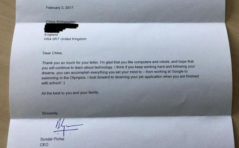 The Chloe letter caught the eye of Google , Sundar Pichai Google’s CEO has answered the job application. He also wrote in response to the letter that the job after finishing school, they are asked to complete their dream of Chloe.