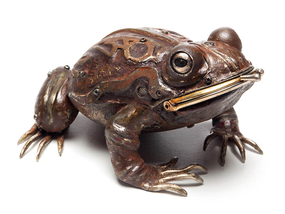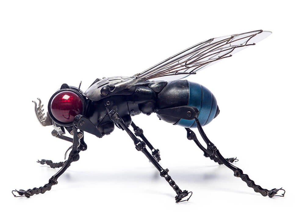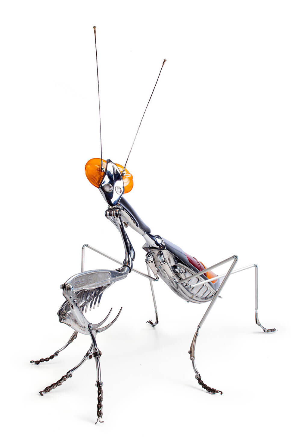 French artist Edouard Martinet assembles faithful interpretations of birds, crustaceans, insects, and other creatures with countless objects from discarded bicycles, cars, and household objects. A bicycle pump forms the abdomen of a dragonfly, windshield wipers serve as the legs of a fly, or the metal logos of a bicycle manufacturer are layered to create the dense scales of a fish. All the more incredible considering Martinet never welds or solders his pieces, but instead uses only screws or fasteners, selecting only the perfect components that “fit” each assemblage like a puzzle.