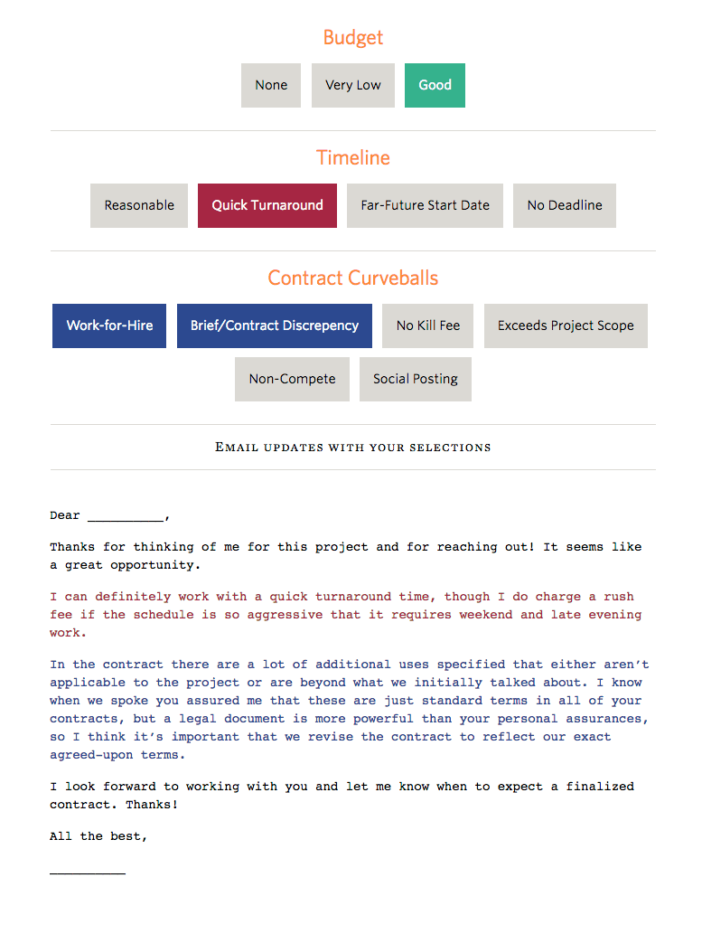 As a freelancer, sometimes finding the right words can be difficult when we interact with the clients, especially if you’re trying to let someone down gently. We all know negotiating is very difficult for even the well-seasoned professional or freelancer. A designer Jessica Hische has created this choose-your-own-adventure style form to help you say “no” to free and low-budget work and to help ask for more favorable contract terms before the start of a project.