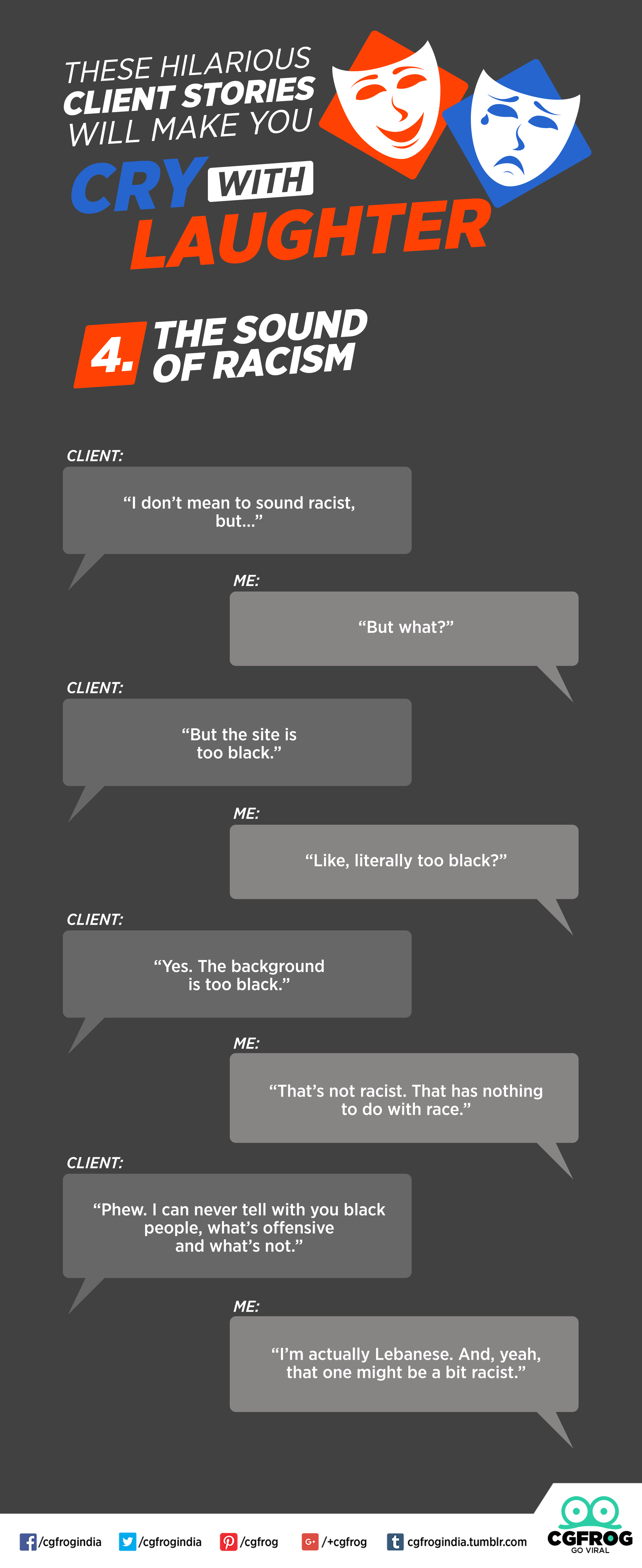Home Humor These Hilarious Client Stories Will Make You Cry With Laughter 9 years ago 9 years ago These Hilarious Client Stories Will Make You Cry With Laughter1 min by Ramesarv Amit 3708views 3. Acrylic Font 4. The sound of Racism Head to the Clients From Hell website for more stories that will make you cry with laughter. Post PaginationPrevious12Next Post Bad Clients, Client is always right, Client Stories, Clients from hell, Designer Vs Client, Designer's Life, Designers Story, Graphic Designer, Hilarious Client Stories, Nightmare clients, Ridiculous Client
