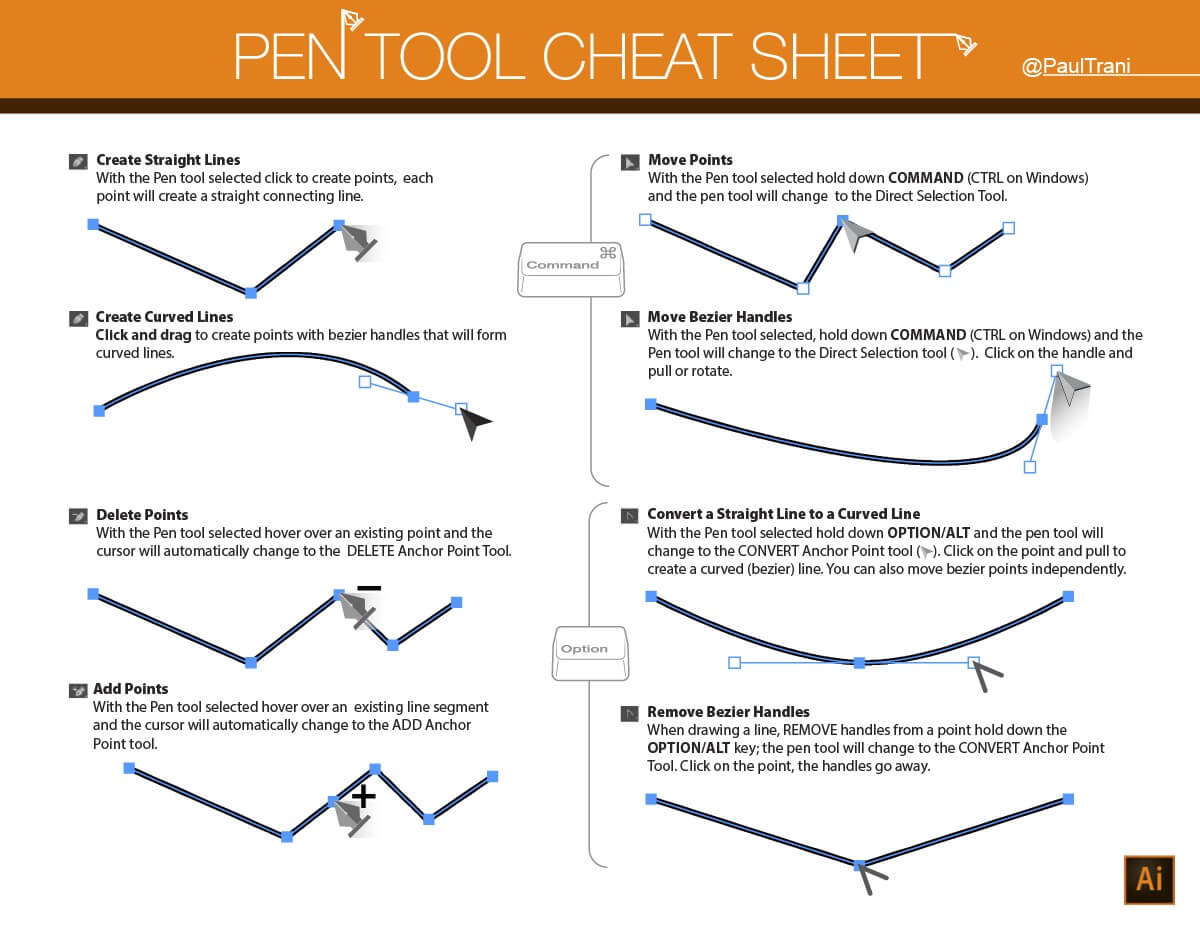 How to Use Pen Tool in Illustrator: There is no doubt that the Pen Tool is one of the best and the most powerful graphics editing tools in Adobe Illustrator. But sometimes it can be confusing and frustrating also. Paul Trani, who is a senior worldwide Creative Cloud Evangelist for Adobe, is behind this “Pen Tool” cheat sheet for Adobe Illustrator. cheat sheet for Adobe Illustrator.