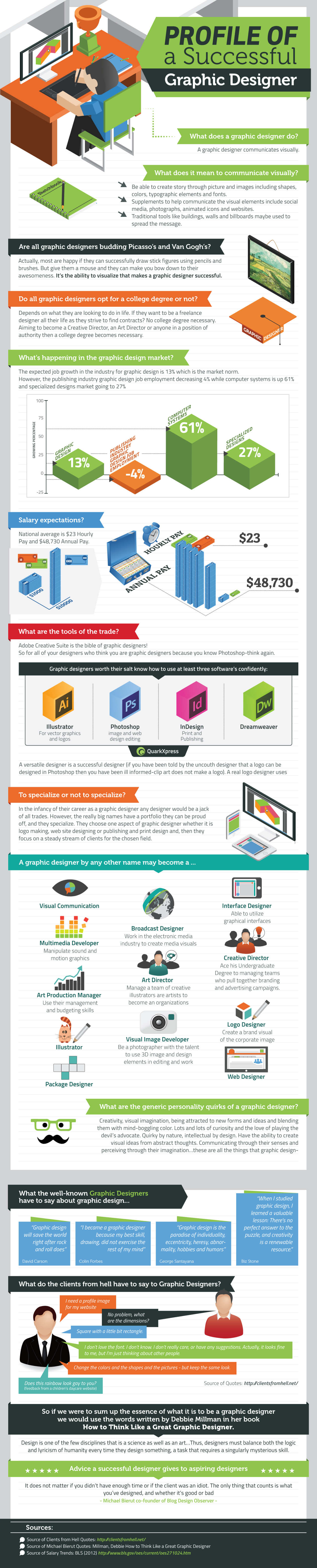 Logo Design Guru has created an infographic contains plenty of useful information, including education, the average salary in the US, and character traits one should have to succeed as a graphic designer. They’re even quotes from both experienced graphic designers and their design clients. The latter are hilarious, but they’re an integral part of the job.