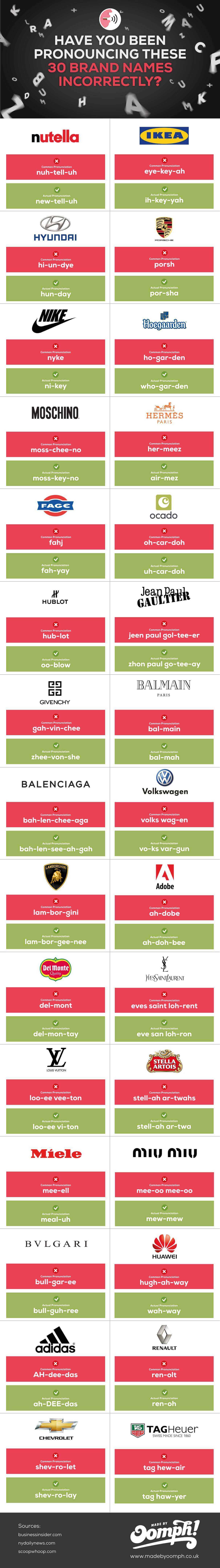 If you do not suppose you have, prepare to be shocked with our infographic below. In this post we’ve added infographic details of some of the most usually mispronounced brand names with their logos, and lists specifically how they must be said. For example from sporting brands like ‘Nike’ being pronounced ‘ni-key’, car brands like ‘Volkswagen’ being pronounced ‘vo-ks var-gun’ and software company labels like ‘Adobe’ being pronounced ‘ah-doh-bee’.