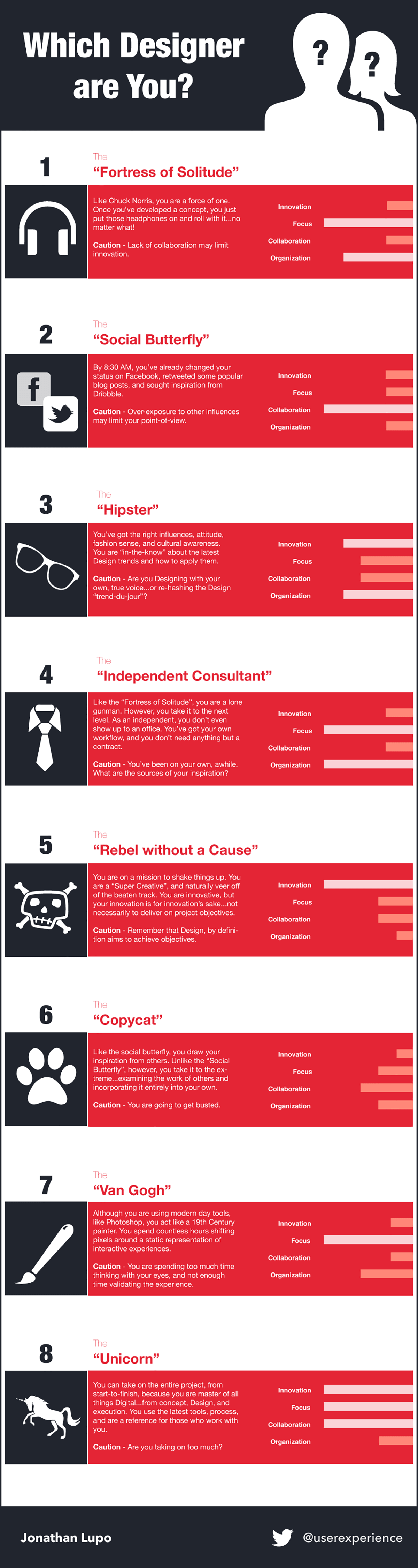 What Type of Designer Are You?: All designers know as they have different personalities. Each designer has a different way of working, and each of these personas has positive and negative traits. Which one are you? Or, are you a combination of multiple Design archetypes? We have also previously two-part series of Designers Vs Regular Peoples: PART1 | PART2. A Designer Jonathan Lupo has come up with an infographic that will help you to identify the type of designer you are, and the level of your innovation, focus, collaboration, and organization.